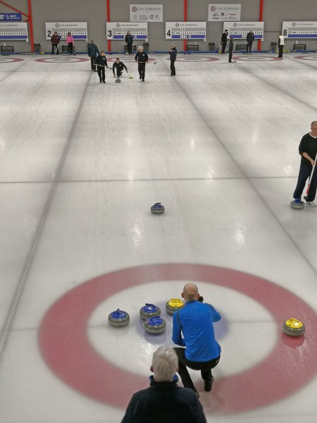As a team, we complimented each other very well with each member contributing positively to our overall score of 70 for the round, with at least 6-8 single putts of around 12–15 feet being a major feature of our game. By the time we reached the curling club we were fairly exhausted (bearing in mind we are all 65 years plus), but after some well-deserved refreshments we rose to the challenge of 6 ends of curling against Gill Black, Morris Anderson, Roger Scott and Iain McLeod representing Peebles Curling Club. Having lost the first end to a single, we drew a shot against five to level the scores and settle ourselves to take 2 shots then two singles to go into the last end 3 shots up where, unable to set a guard we lost a single to a well drawn shot. Our overall position was that we finished fourth out of six teams.