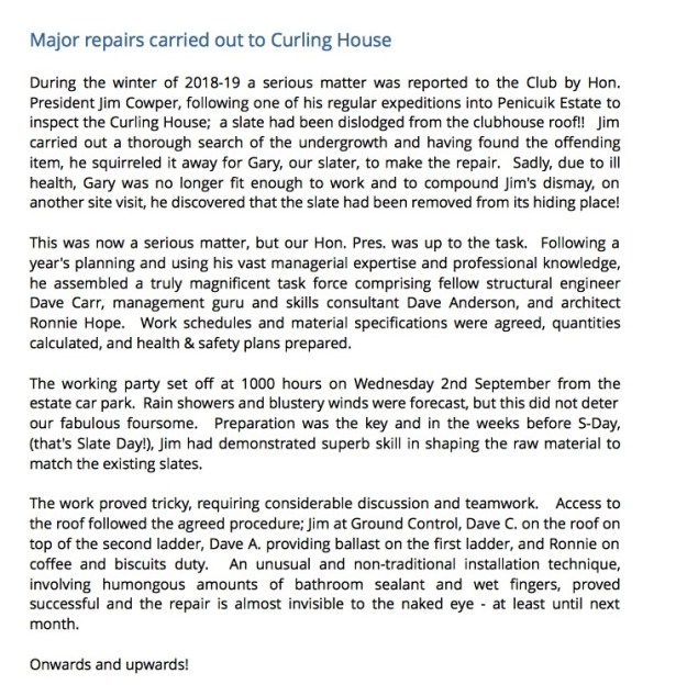 At the end of the season we ended up on equal points with Bank of Scotland at the top of the league, their only defeat coming against us, but our heavy defeat against Edinburgh Rotary put us well behind them on ends and shots. No matter, two teams are promoted and the winners of the three Province Leagues are finally decided by play-offs between the two top teams in each league. Traditionally, these games take place on the same night and are followed by a dinner. The grand play-off was due to be played on 26th March but sadly, for obvious reasons, this was cancelled.