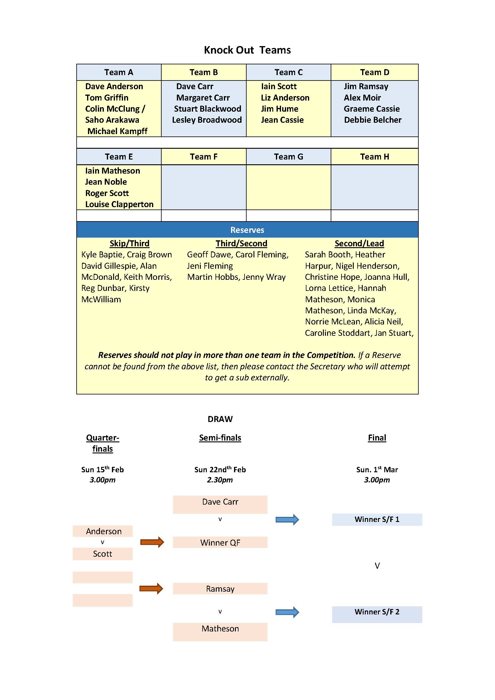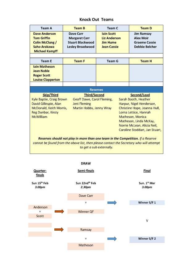 Reserves listed are based on those who have not opted-out so far. If anyone definitely does not want to be a Reserve then please advise the Secretary immediately. Please note that, in Team Anderson, Tom Griffin has replaced Alister McDonald, and Ian Robertson has been replaced by a shared position of Colin McClung and Saho Arakawa. .