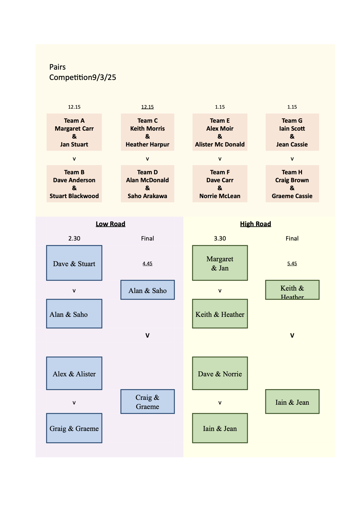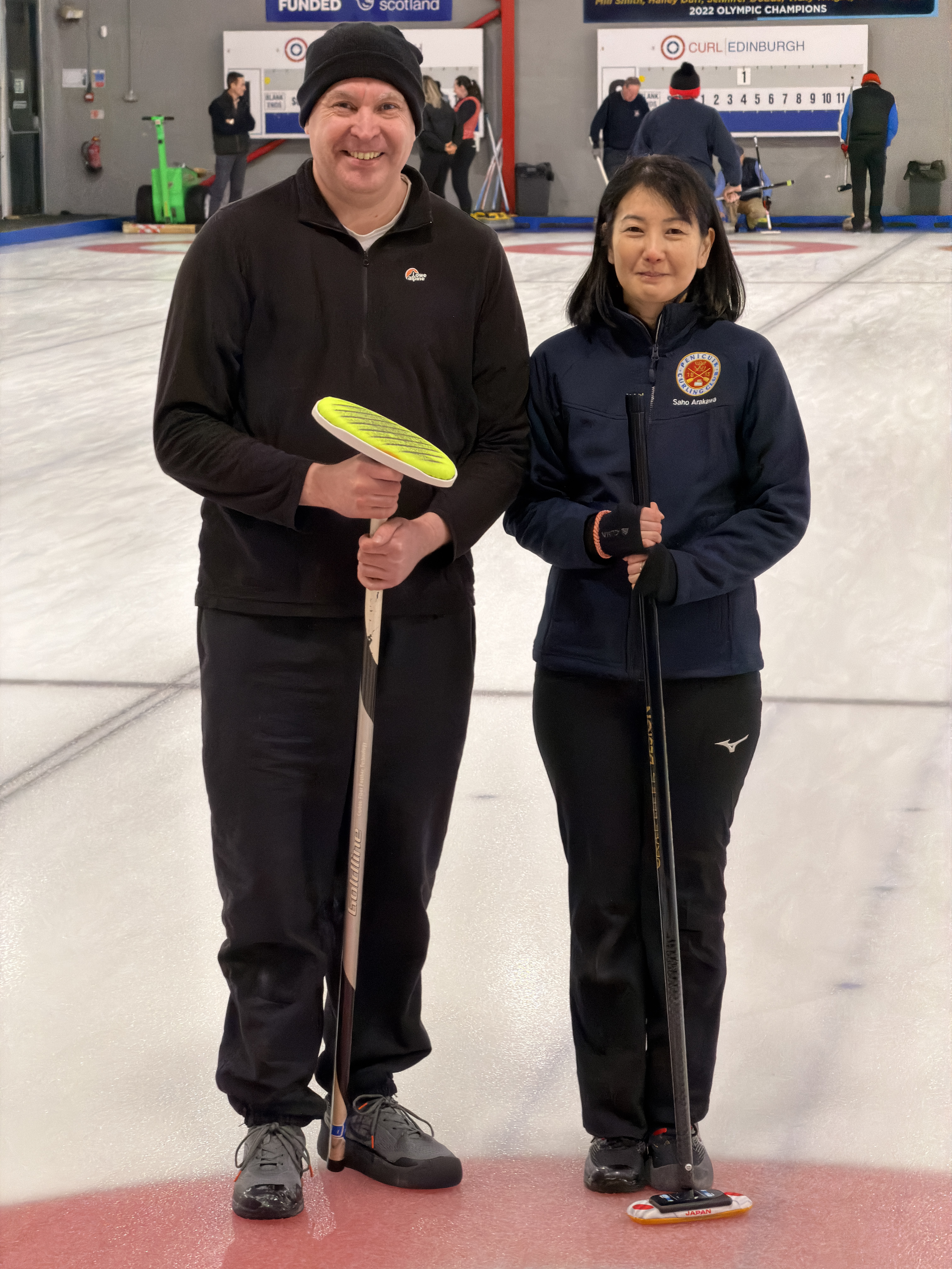 You can see in the chart below that after the first rounds Alan McDonald and Saho Arakawa faced Craig Brown and Graeme Cassie in the Low Road final. There was a shake of hands before completing the 4th end as Alan and Saho had scored a 5 and a 1 in the first two ends. Craig and Graeme managed a 4 in the third end but when in the fourth end Alan and Saho were lying with 2 hidden stones, it meant that the game was complete.