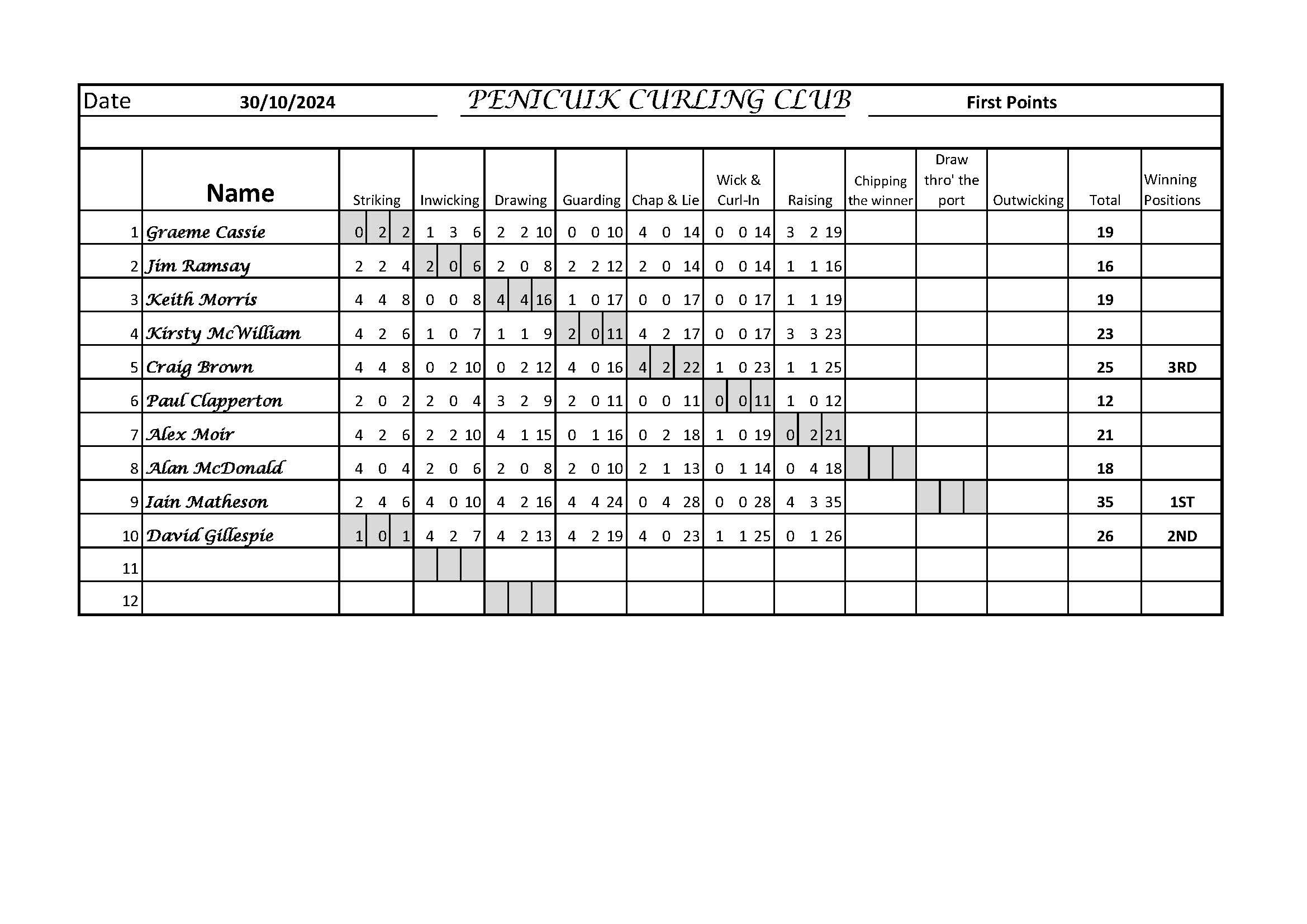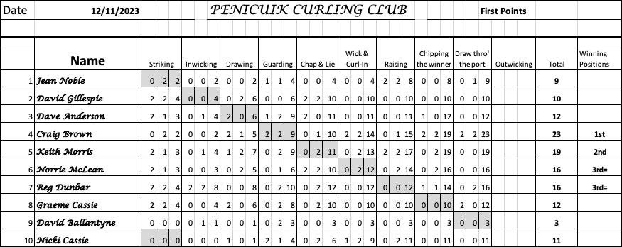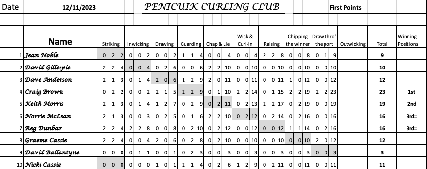 POINTS 12/11/23 Played on 1 Sheet Winner Craig Brown