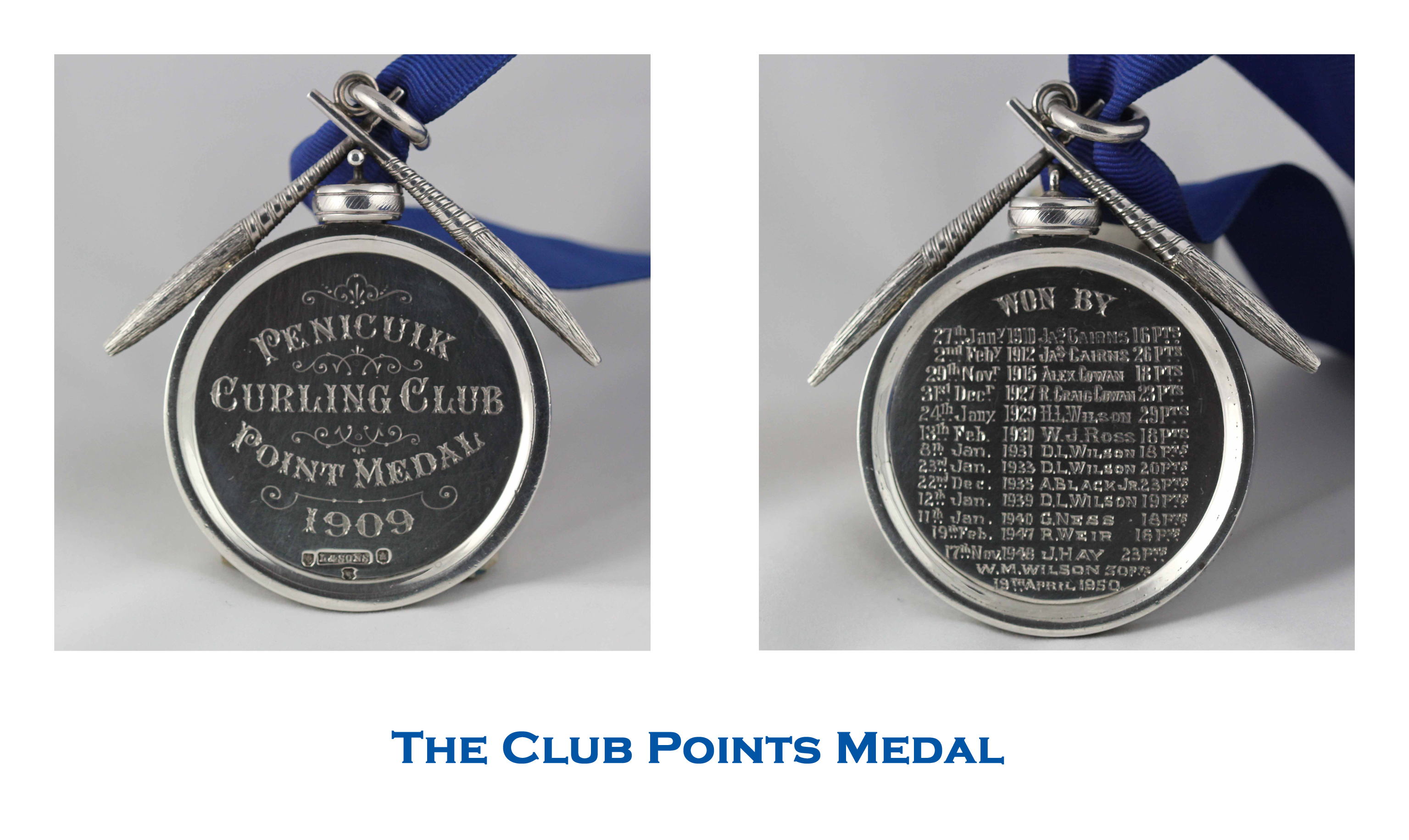 This latter medal was first gained in 1909 and it is engraved with the names of winners up to 1950. After that date, the medal was presented in a small leather box with a silver front plate inscribed with the names of subsequent winners up to 1990, thereafter the boxed medal was presented in a wooden curling stone. It is currently awarded for the First Points Competition.